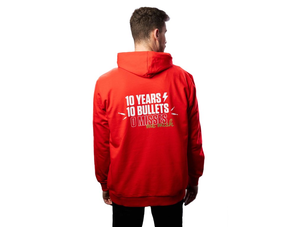 Červené blesky, takhle nám dost často říkají. Design mikiny se v tom trošku odráží a také se opírá o desetileté výročí našeho týmu. Pohodlí mikiny je must-have, nicméně nás baví i dobře formovaná kapuce a prostorná kapsa na břiše. 10 bullets - 0 misses. We wish, ale miss s tímhle kouskem fakt neuděláš!